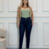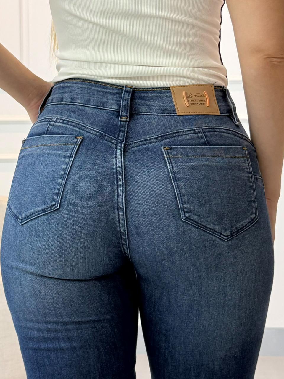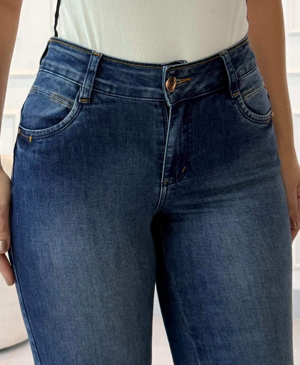 Jeans azul médio, com cintura média-alta e modelagem ajustada do quadril ao tornozelo. Confortável, versátil e com excelente recuperação.
