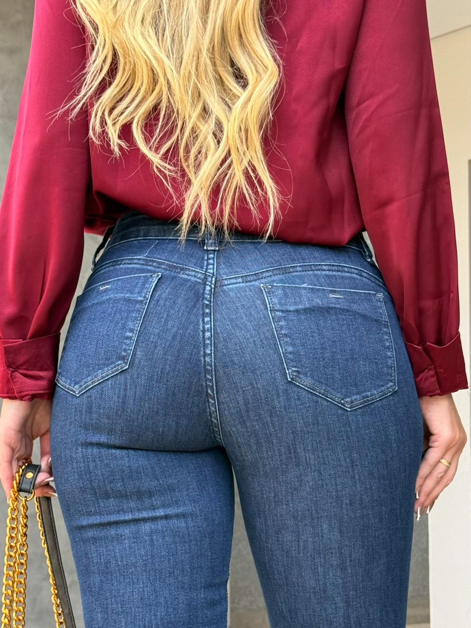 Nas costas, a pala redonda ajuda a valorizar o caimento, deixando a peça ainda mais feminina. Sua lavagem em padrão escuro reforça a versatilidade e a elegância do jeans, tornando-o perfeito para composições do dia a dia ou produções mais sofisticadas.
