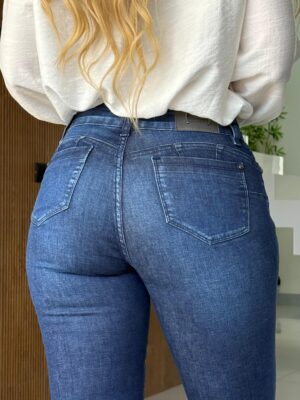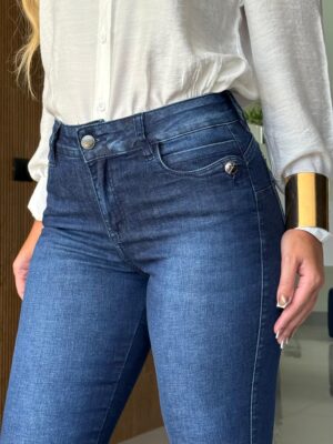 Detalhes sofisticados, como os botões no bolso frontal e as tachas na barra, enriquecem a peça, conferindo um toque atual e cheio de personalidade. A lavagem escura com lixados e efeito used traz profundidade e sofisticação ao jeans, ideal para composições versáteis que transitam do dia à noite com charme.