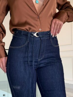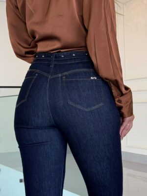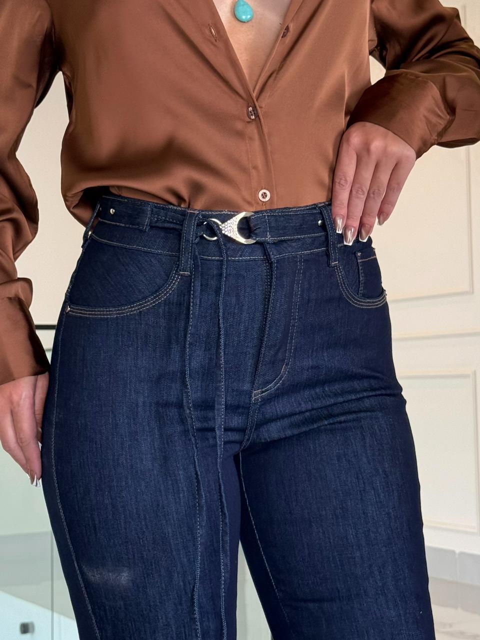 Para completar, o cinto com detalhe em metal e pedras traz um toque de estilo e sofisticação, elevando o jeans além do básico e adicionando um acabamento moderno e refinado à peça.