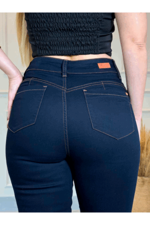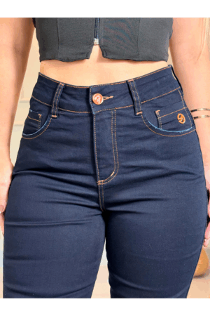 Os detalhes exclusivos, como a placa no cós, botões e rebites em tom diferenciado, além dos apliques de ilhós com strass, acrescentam um toque de glamour sutil que brilha em qualquer ocasião.