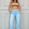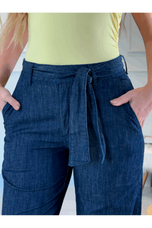 Seu cós alto com amarrador frontal garante ajuste prático e moderno, enquanto os bolsos frontais tipo faca e os bolsos traseiros adicionam funcionalidade sem perder o estilo. O tecido leve de alfaiataria jeans traz uma aparência refinada com toque confortável.