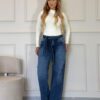 Modelagem: wide leg (perna ampla, barra reta) que alonga e dá movimento