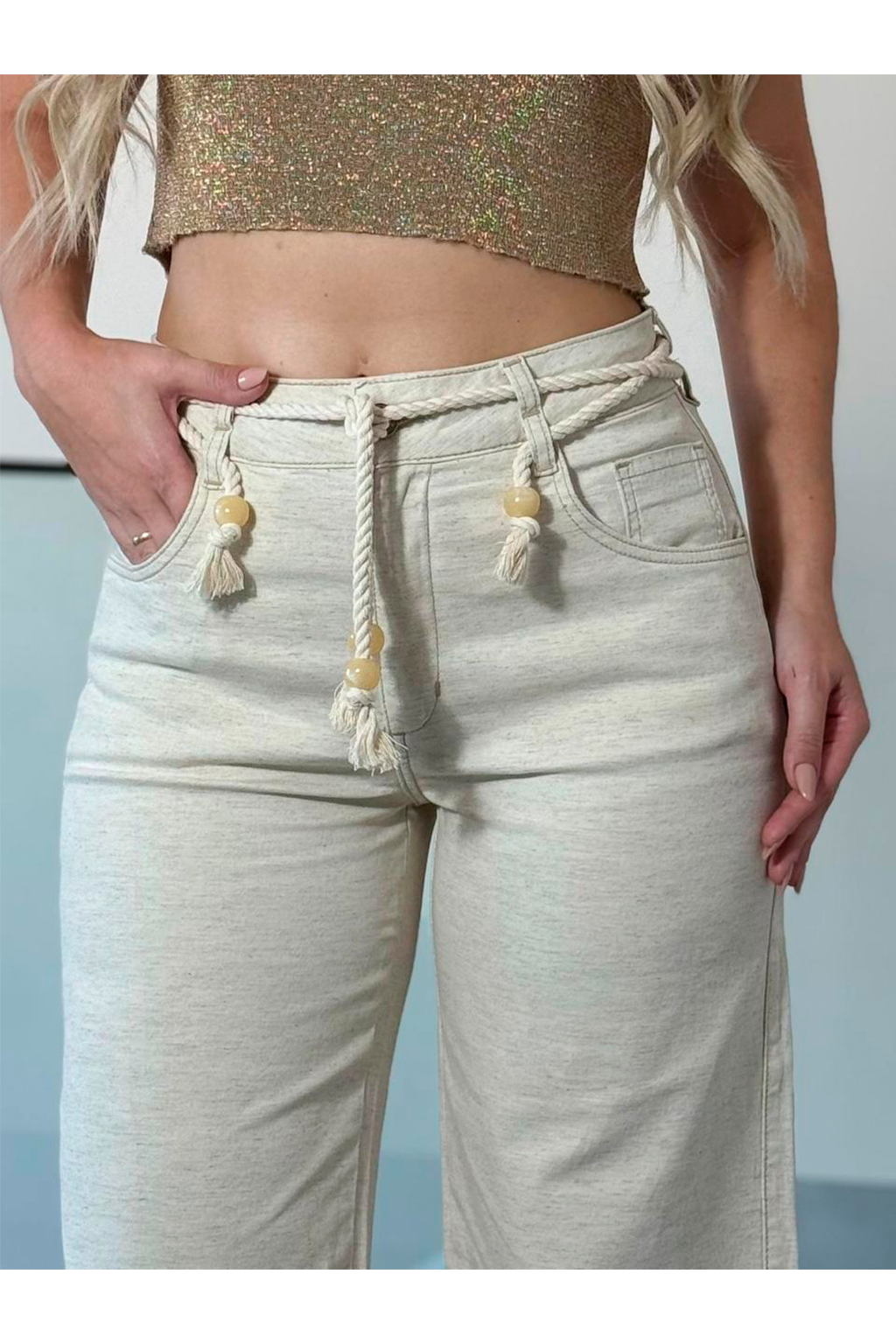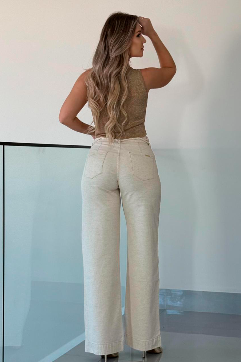 Modelagem: wide leg de perna ampla e barra reta; cós médio/alto com passantes